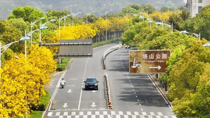 在塔山路道路兩旁的黃花風鈴木正值最佳觀賞期,遠望如金色云霞飄落人間,近觀似風鈴垂掛,姿態婀娜。